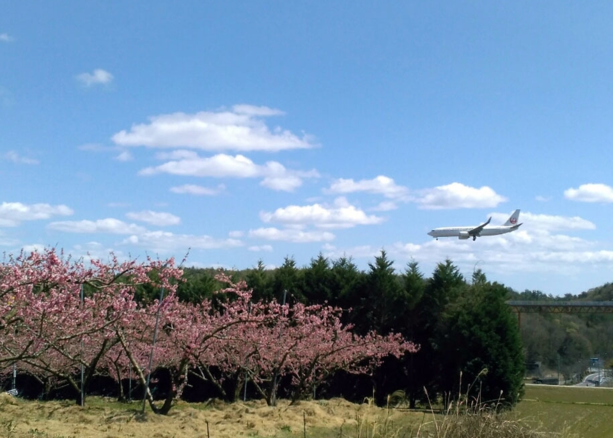 ちょうど飛行機の離着陸が良く見える滑走路沿いなので、スポッターの方もよく撮影をされています。この辺りは清水白桃発祥の地に近く多くの桃畑があります